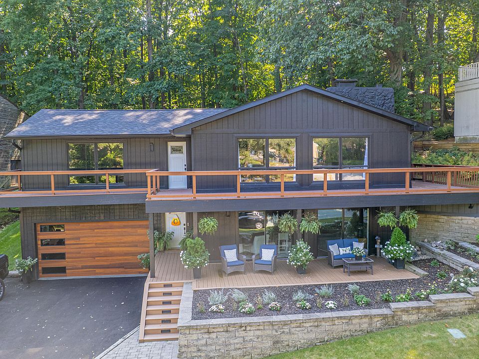 Stunning updated Shorewood Forest home situated on rarely available wooded lot. This home boasts an upgraded cooks kitchen that includes Viking Range and hood, walk-in pantry and quartz countertops. The great room features an open living layout w/ gas fireplace and gorgeous floor to ceiling windows that offer a panoramic view which brings in ample natural light. The primary suite has all the bells & whistles including a large walk-in closet, his/hers vanities and walk-in shower. Guest beds are generously sized along w/ 2 more updated full baths. Cozy yet functional lower level great room is home to a gas fireplace & wet bar. Not to mention a golf simulator room with plenty of additional seating. The entertainment continues as you walk through sliding glass doors to a 30' x 40' private deck which features a 5' deep MasterSpa Trainer w/ hot tub! Additional home features include large laundry room w/ built in cabinet, attached heated 2.5 car garage with additional storage cabinets, wrap around deck and lower level covered porch, additional storage under deck and fenced back yard. Mechanical updates include new furnace 22', tankless hot water heater '22, A/C in '22 and new roof '23. This is truly a rare find and ready to call home!