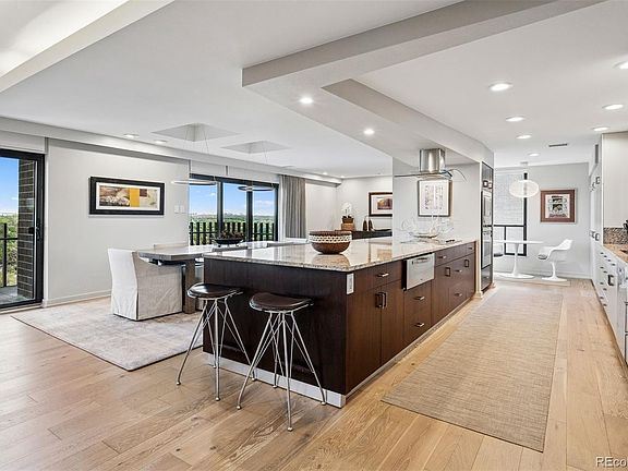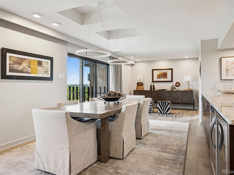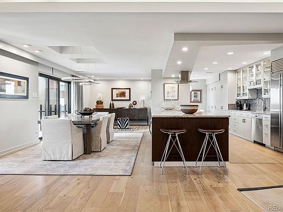 Every detail has been recently curated by a leading Denver designer, with a palette of warm, luxurious finishes that feel both timeless and current—designer lighting, wide-plank hardwood floors, plush wool carpeting, and custom linen drapery with solar shades. The expansive layout flows seamlessly, beginning with a chef’s kitchen outfitted with high-end appliances, abundant cabinetry, generous counter space, a walk-in pantry, and a welcoming eat-in nook.