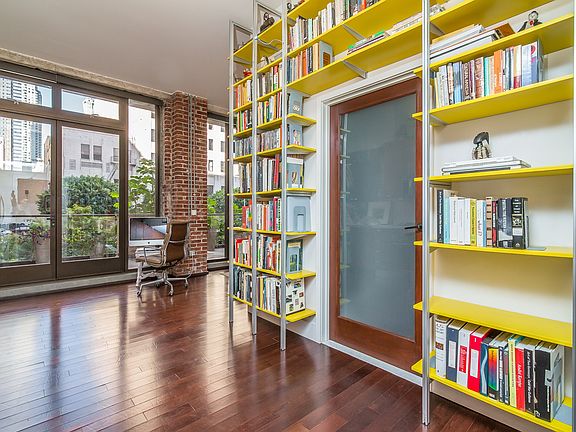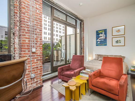 Available for lease, this studio loft surrounds you in the glamor of the historic Rowan building in the happening heart of Downtown LA. High ceilings and oversized windows fill the space with natural light, and with two sets of glass doors you'll enjoy seamless access to the huge private balcony where evening cocktails will taste sublime. Stylish craftwork with modern flair includes wood flooring, exposed brick, custom bathroom tile, and the open kitchen appointed with quartz countertops, stainless appliances, Italian cabinetry by Scavolini and in-unit washer + dryer by Bosch. Building amenities include 24 hour security, controlled access and well-maintained community areas offering gardens, a plunge pool, jacuzzi, lounge and outdoor dining with gas grills + fire pits for you and your friends to enjoy. Coffee, dining, groceries and nightlife are right outside your door at Big Man Bakes, Kozu Nori, PI LA, Bar Ama, The Grand Central Market, Whole Foods, Alamo Drafthouse and so much more. Tenant pays electricity. For pets, call.
