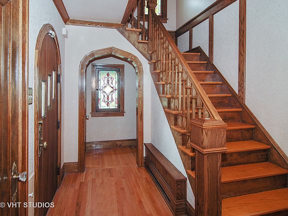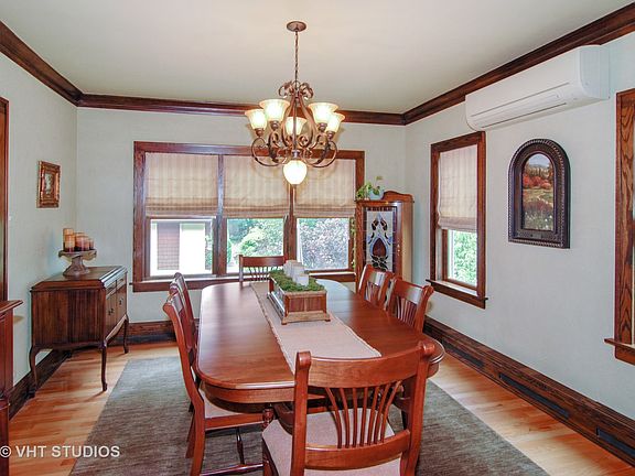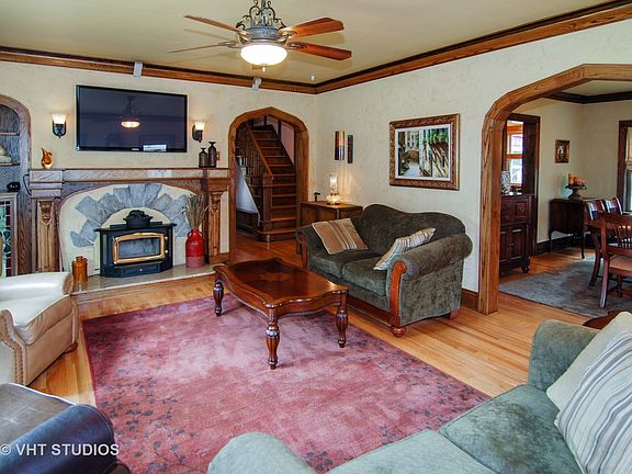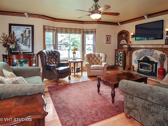 Stately three story English Brick situated on a beautifully landscaped one of a kind half acre lot with two separate patios, a dramatic pond, & great open green space for summer gatherings - a gardener's delight. Special features include a dramatic staircase, gleaming hardwood floors, stained glass windows, large living room w/fireplace, formal dining room, large eat in kitchen w/granite counters, copper ceiling, new stainless steel appliances, & mud room. Second floor with 3 bedrooms including a master bedroom w/walk in closet, remodeled bathroom with separate steam shower, & 2nd floor washer & dryer. Walk up 3rd floor w/many possibilities - loft style rec room, additional bedrooms, office. In addition windows have been replaced, newer air conditioning with heat pump, 200 amp service, new boiler & hot water tank & upgraded plumbing (2015). Large basement w/huge workroom. Two car garage w/attached storage shed & dry bar. Close to elementary school, Metra, & easy access to expressways.