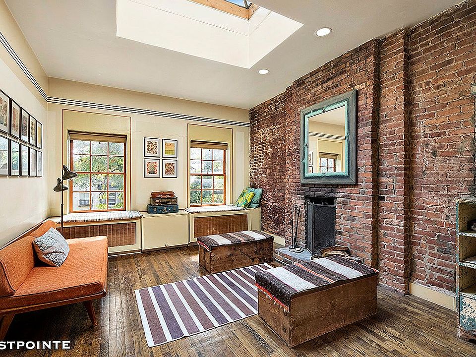 Oversized closetBrick mantel fireplaceHardwood floorsOpen kitchenSun-drenched living space