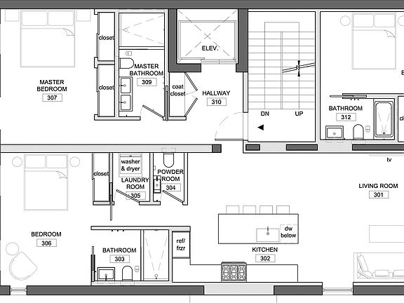 This home also features reveal baseboards, Soss door hinges, 6-inch wide white oak hardwood floors, oversized in-unit washer & dryer, and wireless electronic blinds.