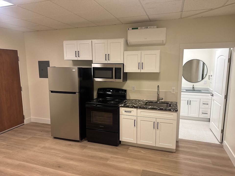 Studio apartment. New modern kitchen, new bathroom with shower, new appliances. Fresh paint. Convenient temperature control 99% efficient, heat or cool depending on your needs. New triple pane windows. New insulation. Commercial doors.