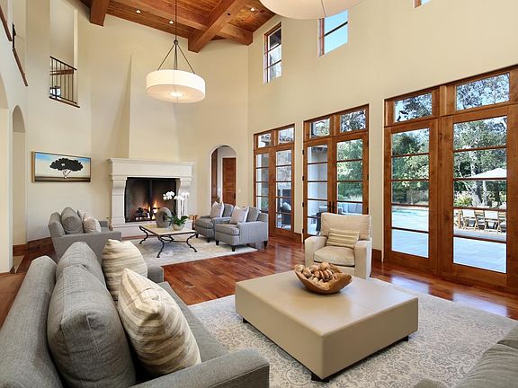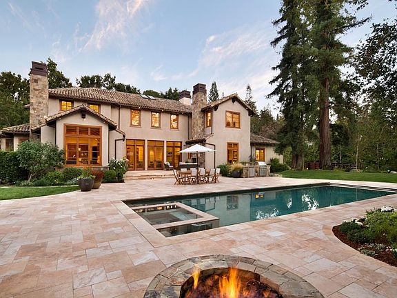 Tuscan-inspired three-level estate home built in 2007 by Pacific Peninsula Group with landscape and exterior hardscape by Thomas Klope Associates. 5 bedrooms - 2 on the main floor including the master suite, and 3 on the upper level. Media room on the lower level with 10' ceilings, built-in cabinetry, projection system and cinema screen. Additional amenities include sound speakers throughout with individual room controls, wine cellar, security alarm, Nest thermostats, 3-zone air-conditioning, UV film on all windows. 1 bedroom guest house with full kitchen and bath with changing room and shower. Pool and spa backed by a garden wall with fountains. Vast limestone terrace with fireplace, fire pit, and outdoor barbecue center for the quintessential California outdoor lifestyle. Excellent West Atherton location with access to top-rated Las Lomitas schools.