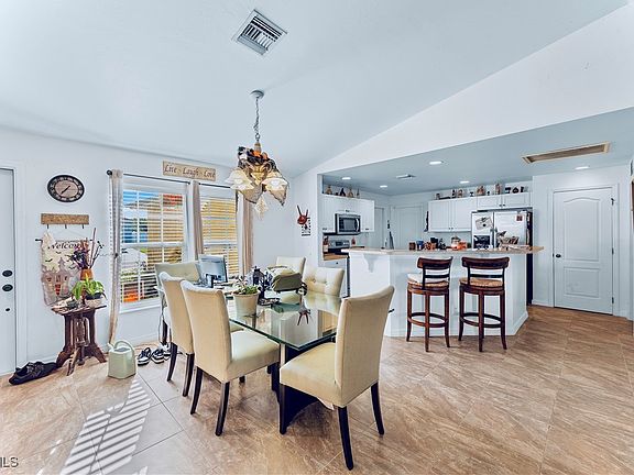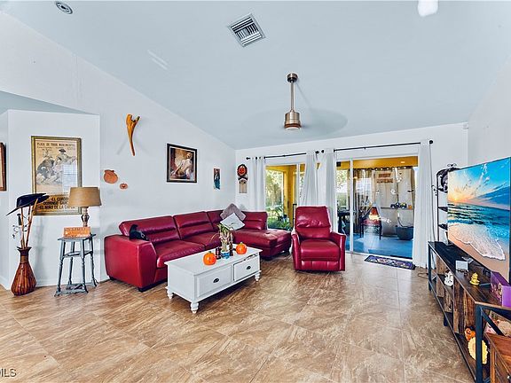 Welcome to this nicely updated 3/2 nestled away on the CORNER of a dead street in the highly desirable WEST side. It has been freshly painted spotlighting a brand new (2024) DIMENSIONAL shingle roof, newer STAINLESS STEEL appliances, enticing porcelain tiled flooring throughout, and a recently remodeled master bath with an admirable tiled shower. This spacious floor plan also highlights cathedral ceilings with a GREAT room & a welcoming breakfast bar, a (2017) HVAC, premium fixtures, recessed lighting, custom mirrors, r/o system under sink, and a generous screened back patio great for entertaining. It also features an awarding master with a walk-in closer, HIGH SPEED internet, an irrigation system, laundry room under air, decorative shutters, window treatments, and plenty of storage closets. This peaceful property with MATURE landscaping & a fire pit is conveniently located just minutes from all major amenities & a quick commute to Fort Myers. Schedule your showing today!