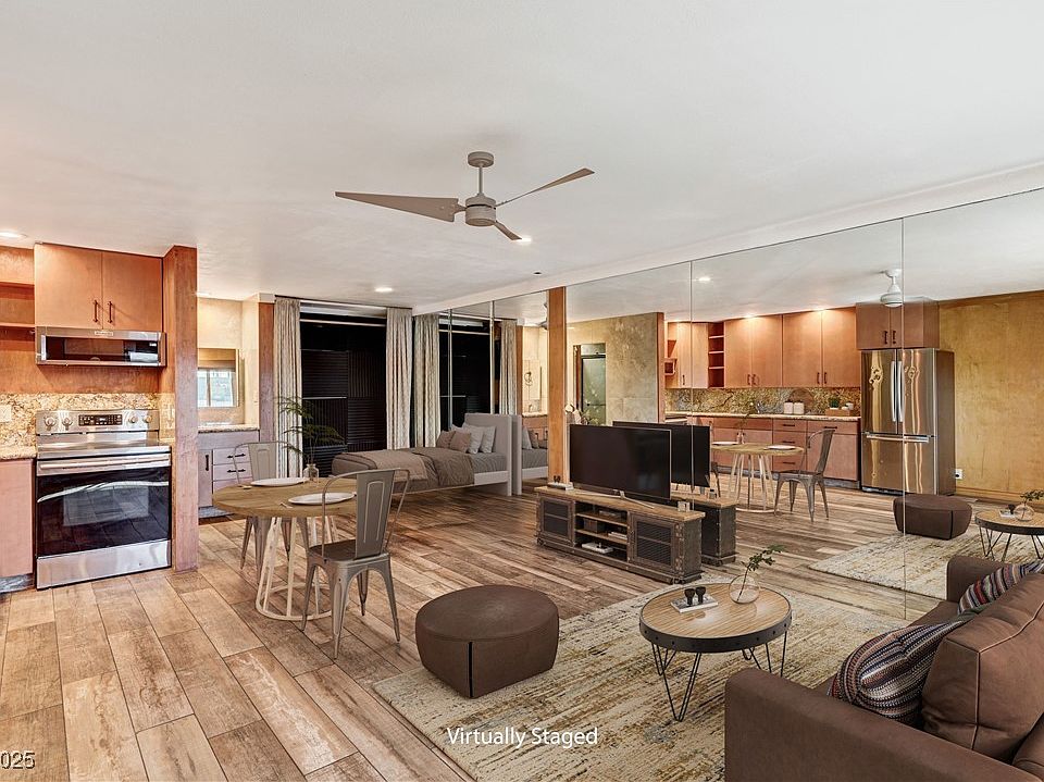 Floor to ceiling tileRecessed lightingStainless steel appliancesFull backsplashTile wood-look flooringGranite countertops