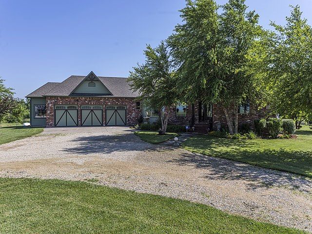 RARE OPPORTUNITY - 20 MINUTES FROM DOWNTOWN WICHITA - DREAM LOCATION - RURAL WATER - NO SPECIALS: This custom-built executive home is situated on 40 rolling, low maintenance acres of native prairie grass & features a 3-acre pond. Add'l adjoining 40 acres optional. It is 1 mi from paved road & located just 2 1/2 mi N of Andover I-35 access. From the moment you arrive, restored antique leaded bevel-glass entry door & sidelights beckon you inside! The soaring 17' vaulted ceiling of the living room features custom open-timber trusses with carved corbels. The mantle of the fireplace was adapted from an English-style salvage piece & crafted from 5 hardwoods. A vast window overlooks the pond & back meadow where deer are often seen grazing at dusk. The formal dining room window looks toward the west horizon & perfectly frames many gorgeous KS sunsets. The crystal chandelier & doors to kitchen are imported from Italy. TV/den area could also be 2nd main floor bedroom (for a total of 5 bedrooms) or an office. Tile flooring on the main level & scored concrete in the basement have radiant heat in addition to the geothermal heat-pump system for economical year-round comfort. Relax in the afternoon on the 16x12 covered deck while watching the bi-planes from Stearman Airfield dance overhead or gather with friends around a fire pit on a crisp evening on the Flagstone patio while gazing at stars unseen in the city. Bring your horses & build your outbuildings - the possibilities are endless! Write your own legacy of many wonderful memories made here on the prairie in this spectacular "designer showhouse!" Taxes shown are for entire 80 acres.