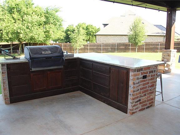 Beautiful custom home on a corner lot with many upgrades and exquisitely landscaped. Each one of the 4 bedrooms has walk-in closets. There's 2 full baths with 2 half baths, one of which is accessible from outside. The living room has built-in bookcases, corner rock fireplace, box beam ceiling, large windows for natural light and it's open to kitchen and dining. The living space continues outdoors under the covered patio that has a built-in grill, fireplace and TV hookups. The kitchen has beautiful granite counters, an abundant of additional eating space that is great for entertaining, stainless steel appliances, gas stove with water pot filler built-in back splash. Neighborhood is gated and close to highway access that makes getting to Mustang, Norman, Moore and surrounding areas easy.