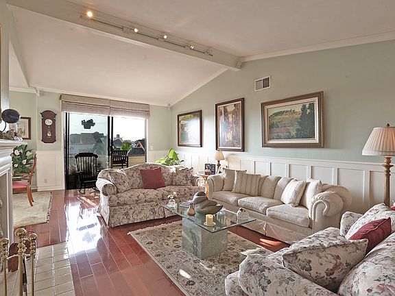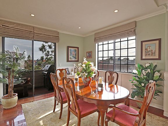 Enjoy Marina living at its best in this highly coveted top floor, corner unit overlooking a quiet courtyard and the Silver Strand. With peek-a-boo views to the South and West, this residence features beautiful upgrades throughout, including Merbau Mahogany wood floors, a wood burning fireplace, vaulted ceilings, built-ins, ceiling fans, and two patios. Generous master suite with expansive walk-in closet and ensuite bath with double sinks and eight foot double headed steam shower. Watch the sunset from your private patio, and enjoy entertaining or relaxing in the courtyard or pool areas. Highly acclaimed community with two saline swimming pools, two spas, four tennis courts, and workout room. Two side-by-side parking spaces. Welcome Home.