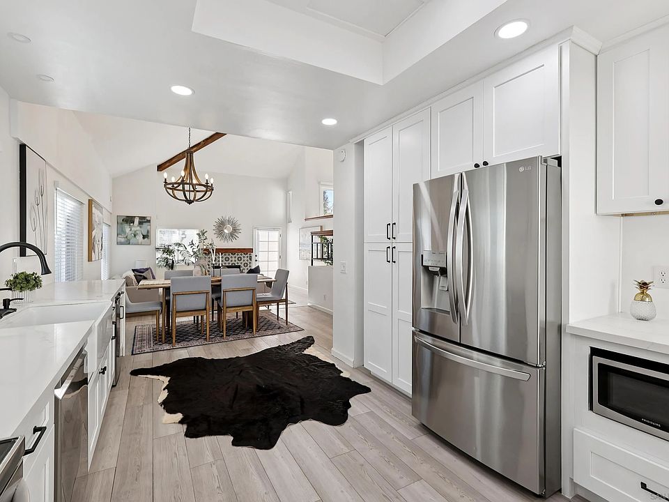 Two patiosQuartz countertopsStainless steel appliancesRevamped kitchenSleek vinyl laminate flooring