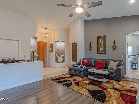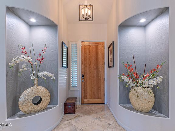 Exquisite 3-bedroom, 2-bath single-story residence featuring an open, split floor plan with elegant travertine and designer flooring throughout. The chef's kitchen impresses with a spacious island, premium stainless steel appliances, and crisp white cabinetry. Indulge in the spa-inspired double shower, unwind in the expansive grassy backyard with a covered patio perfect for entertaining, and enjoy the convenience of a generous 3-car garage. Move-in ready and ideally situated near Desert Ridge, top-rated schools, fine dining, and upscale shopping. Impeccably maintained and designed for modern living — this exceptional home won't last long!