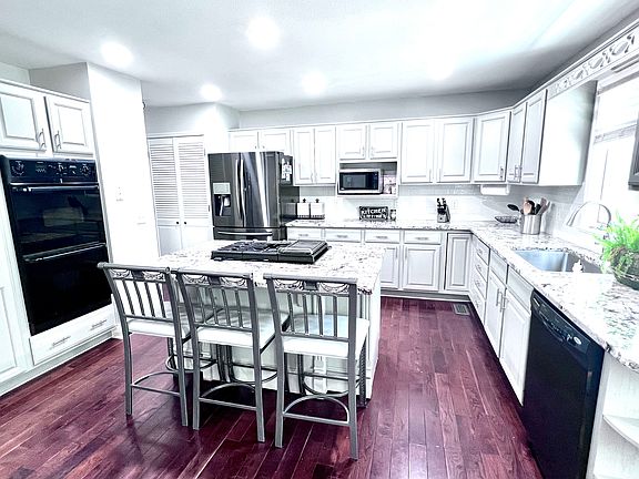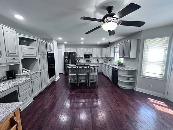 The extra-large kitchen boasts granite countertops, a secretary desk area, bar seating, a breakfast nook, and stainless appliances. The main living areas feature hardwood flooring, while bedrooms have plush carpeting, and bathrooms are finished with luxury vinyl and tile.