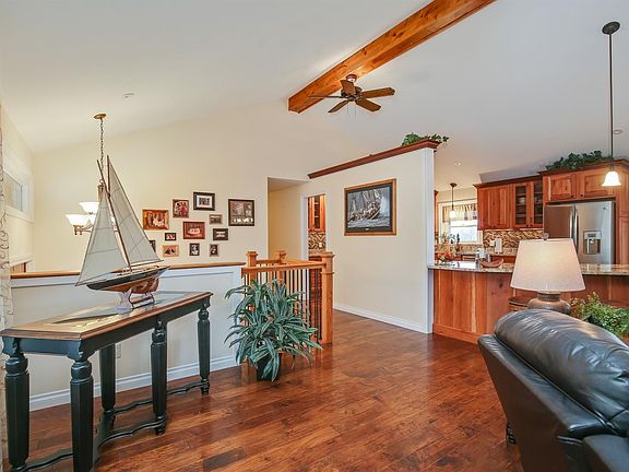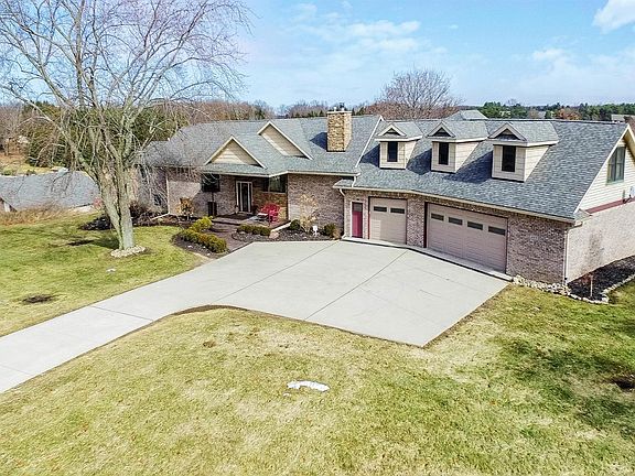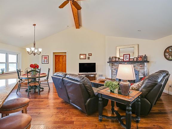 Remarkable home on 5 acres with a pond, heated out building (960 sqft) with a separate driveway. Home features 4 bedrooms and 3.1 baths with premium high-end finishes and radiant heated floors with 6 separate zones. The main level has hand scraped hickory flooring in the great room and kitchen/dining area with cathedral ceilings and elevated rear covered porch off the dining room. Great room has a high efficiency fireplace. Beautiful Chef's kitchen with granite, slate back splash, stainless steel appliances, plus double drawer refrigerator and hickory cabinets. Luxury master suite with 2 walk-in closets and 3-headed shower, soaking tub, double sinks with granite, laundry area and refrigerator. Walkout lower level features kitchen area, family room with wood burning fireplace and 2 additional bedrooms and full bath. Convenience in being able to enter the attached 4-car garage through both floors. Intercom with alarm.