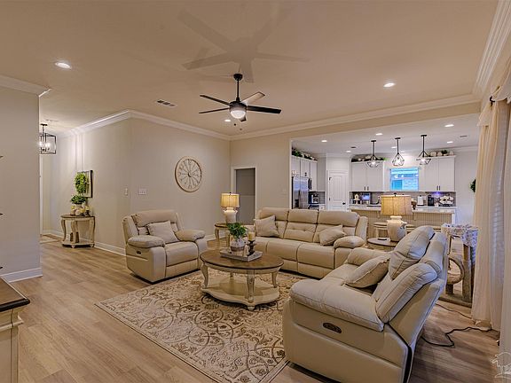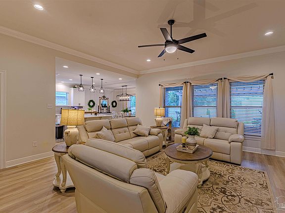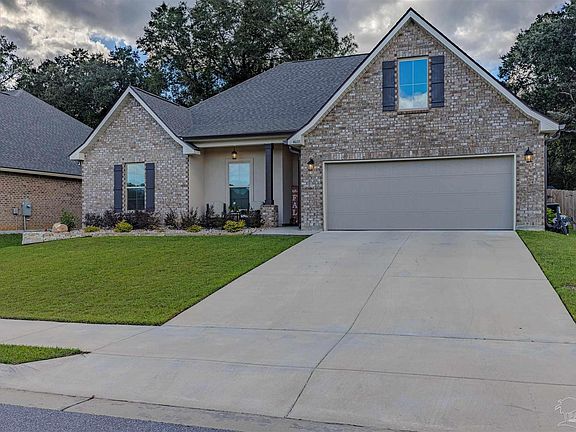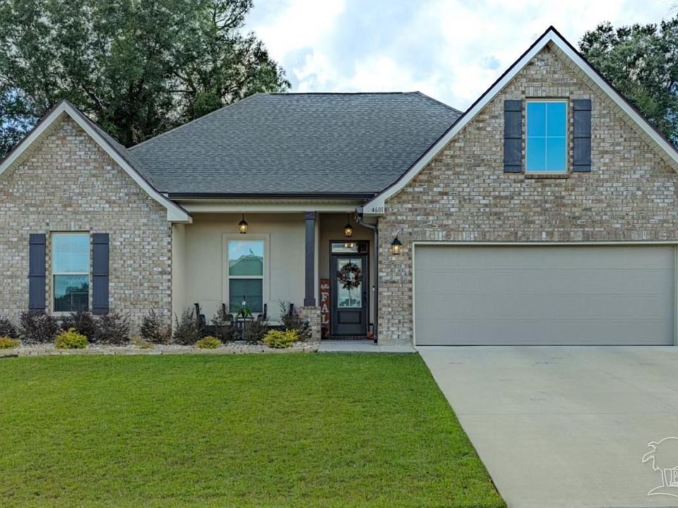 Welcome to your dream home in the heart of Pace, located in the desirable subdivision of Southern Palms! This meticulous 4-bedroom, 2-bath property combines timeless elegance with modern comfort. From the charming brick and stucco exterior to the thoughtfully designed open floor plan, this home is a haven for those who love both style and space. Step into the warm and welcoming eat-in kitchen, complete with a generous center island, oversized cabinets, and stainless steel appliances that make every meal a delight. An elegant formal dining room offers a beautiful space for hosting gatherings, while recessed lighting throughout the kitchen and living areas creates a cozy ambiance, perfect for family evenings or entertaining friends. With luxury vinyl plank flooring spanning the entire house, maintenance is a breeze, allowing you more time to enjoy the things that matter. The spacious owner’s suite feels like a retreat, complete with a luxurious bathroom featuring a separate tub and shower, and a large walk-in closet that offers ample storage. Outside, the large pergola with cobblestone pavers is a serene spot for morning coffee or evening relaxation, surrounded by exquisite landscaping in both the front and backyard. Additional features like a brand new 10x10 storage building, an epoxy-coated garage floor and charming front and back porches add the finishing touches to a home that’s as functional as it is beautiful.