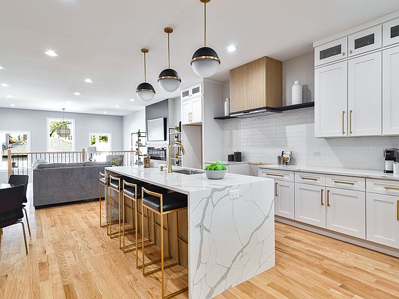 Modern 5 bed, 3.1 bath new construction home! Sharp facade with white and black Hardie siding and stone accents. Open concept floor plan with great natural light. Spacious combined living/dining area with large front window. Eat-in kitchen with Cafe appliances, shaker cabinetry with glass transoms, large center island with waterfall counter and bar seating, and pantry. Adjoining family room with electric fireplace. Rear mudroom with exit to backyard. Sun-filled primary suite with vaulted ceiling, large WIC, and private bath featuring a frameless glass shower, freestanding tub, and dual sinks. Two additional bedrooms, hall bath with tub, and laundry complete the upper level. Finished lower level includes a spacious recreation room with wet bar, two bedrooms, full bath, and utilities. Great outdoor space! Fully enclosed yard with back deck and detached two-car garage. Conveniently located near restaurants, entertainment, shopping, public transportation and parks!
