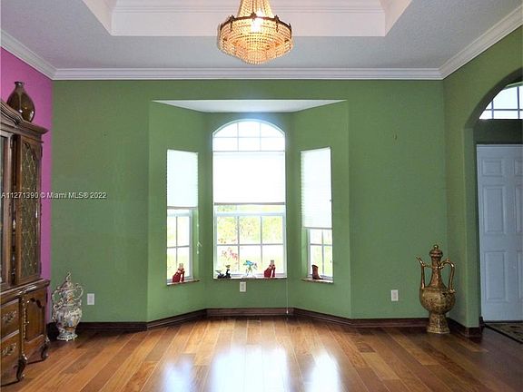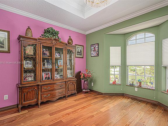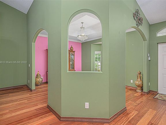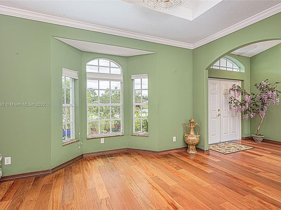 Solid Quality Built CBS Home*Facing Beautiful Water Pond**S-Tiled Roof! Total Sq. Ft. 3814* This home has space for office or In-law with separate entry, or space for 4 bedrooms/Den**Grand Entry with Columns and French Doors* High Ceilings and Large Bay, Arch + Picture Windows for Plenty of Light! Tray Ceilings * Wall to Wall Genuine Brazilian Hardwood Flooring Throughout**Bedrooms are Large and Spacious*Master Bedroom has 2 Walk-in - Closets, & Master Bathroom has Bidet** 2nd Bedroom feels like a master bedroom with 17x16 sq. ft. Walk in Closet & 2 arch windows *Kitchen has breakfast nook, Granite Counters, Bar + Pantry.**New Rheem Water Heater 2022* Wrap around Paved Patio** RS2 Zoned,* Becker Area close to I95 or Turnpike & Tradition*
