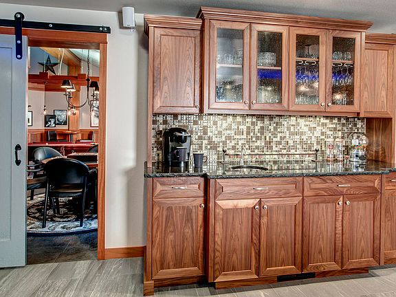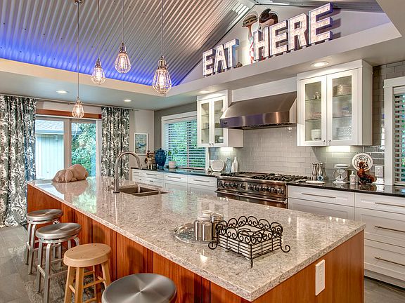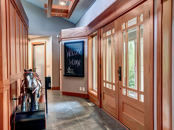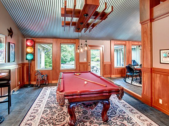 A masterpiece cast in wood, stone and iron, this industrial craftsman rambler in Bothell is outfitted with luxurious custom detailing throughout. Enter beneath dramatic vaulted ceilings lined with corrugated metal panels and accent lighting into a large game room flocked in rich mahogany. Entertaining is effortless with the great-room style family room and kitchen, complete with a wet bar, gorgeous linear fireplace, and easy access to the courtyard with huge patio, fire pit and outdoor audio. The gourmet kitchen boasts a stainless steel Viking appliance suite, custom cabinetry and quartz countertops. Retreat to the master bedroom, furnished with generous built-ins, a walk-in closet and 5-piece bathroom. With three additional bedrooms and two bonus rooms, there is plenty of space for everyone. Luxury meets function with an abundance of thoughtfully designed storage throughout. The property itself stretches over three acres and features impressive amenities to pique a variety of interests: outdoor sport court with lighting, expansive sport field, hobby farm area with chicken coops and small animal pen, barn with loft, and a massive wood shop. For car enthusiasts there is also a 3,000 square foot auto shop with lofted office space and auto lifts. All of these incredible features, plus striking curb appeal with a circular drive and cascading water feature in the Northshore School District.