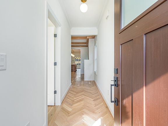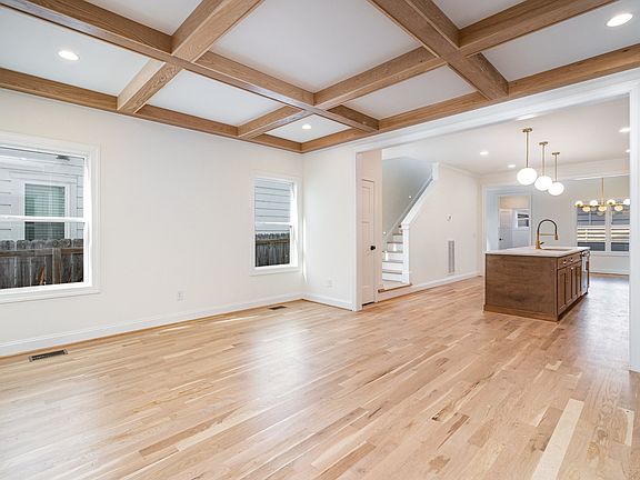 Step inside to discover white oak floors throughout the open-concept living space. The coffered ceiling adds architectural charm and depth, while the stucco fireplace creates a warm and inviting centerpiece. The kitchen boasts high-end finishes, sleek cabinetry, and seamless flow into the dining and living areas—ideal for entertaining.