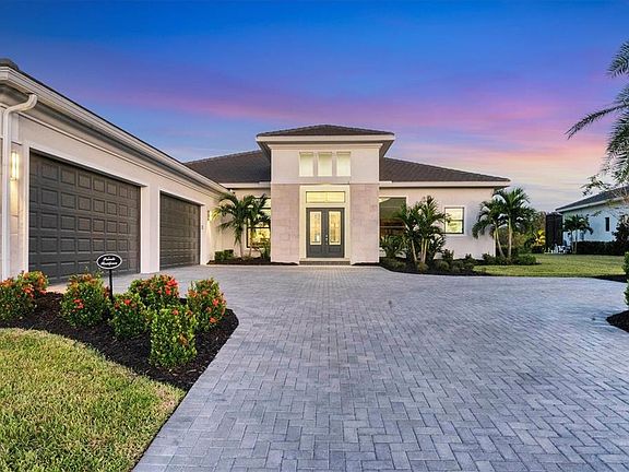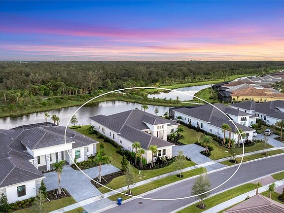 Welcome to Artistry–Sarasota, where you can experience luxurious resort-style amenities, security and maintenance-free living without the CDD fees! This beautifully designed Palmer model with bonus room and four-bay garage provides storm security with impact windows and doors, concrete block construction and concrete tile roof, as well as energy efficiency of spray foam insulation. With one of the optimal floor plans available, this residence offers generous living spaces with ample natural light and showcases desirable views in the community. On one of the few estate-sized lots, you will enjoy the serene and naturistic views overlooking the water as well as the green and lush preserve that borders this side of Mondrian Court. From the moment you and your guests enter through double glass doors, you’re greeted by a wall of sliding glass that invites you out to the covered lanai and breathtaking views. Continuing throughout the home, you will see countless elegant features and design on display. This luxurious residence offers spacious living areas, three-bedrooms, 4.5 baths, a private office/den, a formal dining room, great room and a designated pool bath, a large bonus room with built-in wet bar, remote shades and an exterior door to access the covered lanai. The outdoor living area provides ample space for a pool and is plumbed and wired for an outdoor kitchen. The home is equipped with several significant upgrades, from oversized modern style crown molding accentuating the 12-foot tray ceilings to gorgeous plank wood-grain tile flooring, the extended kitchen island with quartz waterfall edges, upgraded cabinetry, professional appliance suite including a natural gas cooktop with range hood, double wall ovens, built-in refrigerator, beverage center, sophisticated tile and countertops, accented by brushed hardware, tankless gas water heater, bonus bath serving as pool bath and a rare four-bay garage. When it comes time to retreat and relax, escape to your generous primary suite with a designated space for a sitting area, exterior door with access to the covered lanai, a luxurious primary bath with large walk-in shower, garden tub, dual vanities, water closet and two walk-in closets. On other side of the home, you will find two additional en-suite bedrooms with numerous upgrades, bonus room with wet bar, pool bath, laundry room and a half-bath for guests. In addition to all the aesthetic features, this refined residence showcases the epitome of peace, serenity and privacy. Community features and amenities include two gated entrances, huge pool, clubhouse, tennis and pickleball court, playground area and fitness center, all surrounded by tranquil, landscaped walking paths. Artistry is a maintenance-free, upscale community with no CDD fees, convenient to just about everything that makes Sarasota and Lakewood Ranch desirable, particularly the shopping, dining, entertainment, excellent schools and our destination beaches. There is an art to living well and you’ll find it here in Artistry, every day!