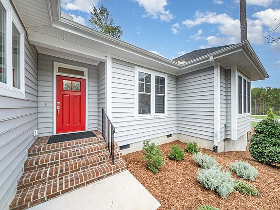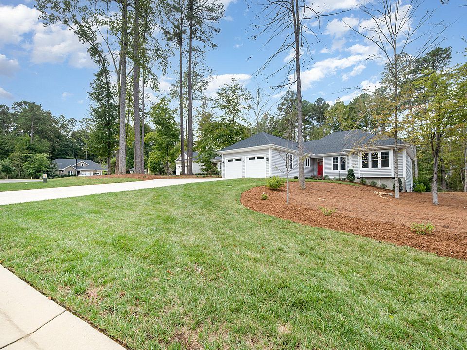 This essentially new custom built, one-level home is located in a Fearrington Village neighborhood of newer homes designed to balance neighborhood connection and privacy. It is located on a quiet, low traffic cul-de-sac within walking distance to the many Village amenities and The Duke Center for Living. The home has extensive upgrades including, appliances, extra cabinetry and built-in bookcases, custom closets and window coverings, irrigation and more! The open design features high ceilings and numerous windows allowing for abundant natural light and exterior views. The chef's kitchen has soft-close drawers and cabinets, a convection range with induction cooktop and stainless steel backsplash, an island with seating capability and built-in microwave, LED under-counter lighting and upgraded quartz counters and a breakfast area with built-in desk and cabinetry. Double doors from the living room lead to the primary bedroom suite, adjacent bath with double vanity, upgraded lighting and plumbing fixtures, barrier-free walk-in shower, bidet, and walk-in custom closet. Adjacent is a study with a full wall of built -in cabinets and bookshelves. The large living room with adjoining dining room features a linear gas fireplace with sparkling glass media and passive vent heating. The added spacious sunroom is separated from the living room by French pocket doors and opens to an oversized low-maintenance deck with newly planted landscaping to enhance privacy. On the other side of the home are two additional bedrooms and a full bath. The laundry/mud room with built-in cabinets and hanging/storage unit connect the kitchen to the two-car garage. Move in ready!