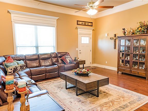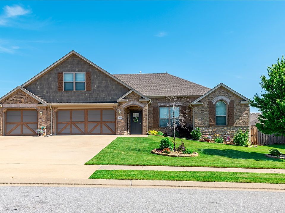 Welcome to this stunning 4-bedroom, 3-bath Craftsman style home in the desirable Willowbrook Farms subdivision. The versatile 4th bedroom upstairs can double as a bonus space or flex space. Enjoy the warmth of a double-sided fireplace in living room and kitchen, complemented by custom cabinets and beautiful wood floors throughout. The master suite boasts three closets, a luxurious jacuzzi, and a custom-tiled walk-in shower. A brilliant layout, with two bedrooms across the home from the primary suite and the fourth bedroom/ bonus room upstairs. The fenced backyard features a covered patio and built-in gas fire pit, ideal for entertaining. Plus, a spacious 3-car garage and beautiful landscaping completes this perfect family home. Ideal location, less than 15 minutes to Walmart Home Office and XNA. Don't miss out on this exceptional property!