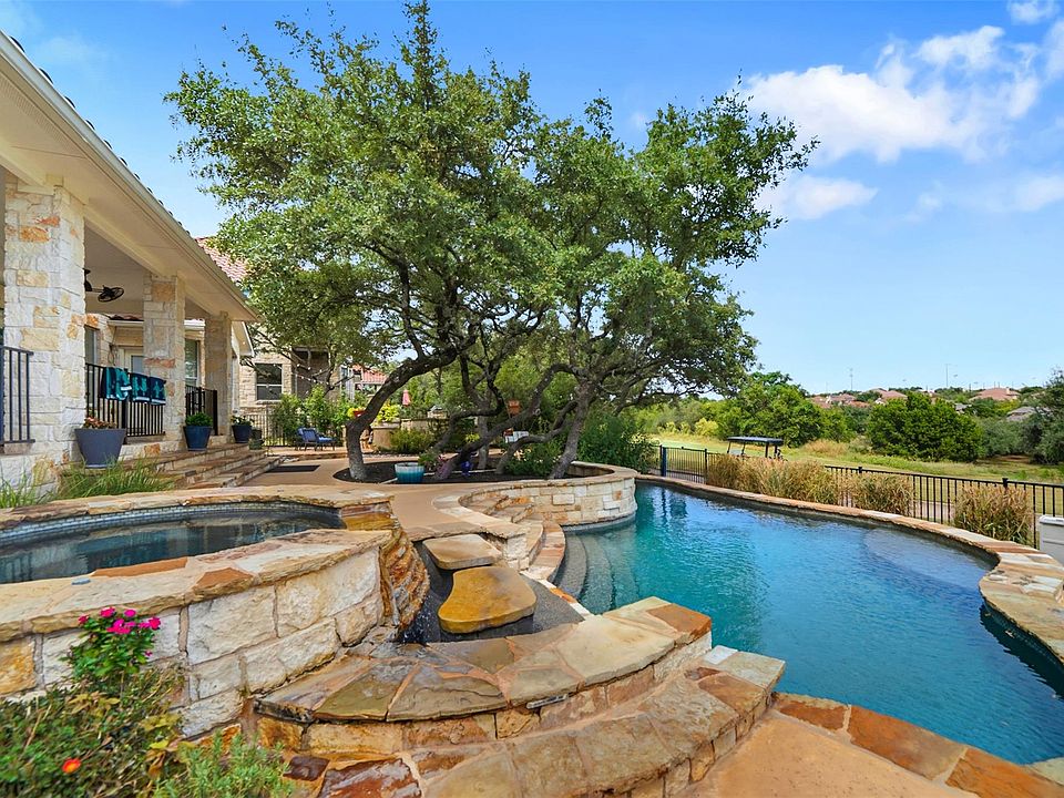 Backing to Tee Box #14 of the Falconhead golf course, with wide-open golf course views and a thoughtfully upgraded interior, this home is equal parts impressive and inviting. The smart layout features 4 spacious bedrooms, including the owner suite and a secondary suite on the main floor, plus 3 full baths (with both downstairs bathrooms beautifully updated). Inside, you’ll find two dedicated flex spaces behind glass french doors, perfect for offices, creative studios, or workout rooms; one up, one down. When it’s time to unwind, the upstairs media room and dual living areas give everyone a place to spread out. Entertain in style with a formal dining room and a butler bar, or enjoy the updated kitchen with its 2024 Frigidaire 5-burner stove, Bosch dishwasher, and generous storage. Hardwood floors were added in 2019, and fresh paint throughout in 2024 keeps everything feeling bright and current. The owner suite bath includes thoughtful touches like an extra-tall toilet and Brondell FreshSpa bidet. Out back? It’s a private staycation. A covered patio with ceiling fans sets the stage for year-round relaxing, while a sparkling pool and spa are framed by shaded lounge areas, including one in front of the outdoor fireplace and another tucked next to the built-in grill. Want sun instead of shade? Two cozy sunbeam seating areas let you soak it in, whether you’re poolside or staying splash-free a little farther out. Additional perks include a 3-car garage with an RV charger and Jeep top lift, updated HVAC (2022), updated water heater (2023), fresh landscaping (2024), exterior paint (2023), and a dialed-in irrigation system (2025). Even the pool has had a full refresh; chlorinator, motor, and serviced cells, all done in 2024. Homes with this kind of outdoor setup and thoughtful upgrades don’t come around often, especially not with a golf course view that will take your breath away!