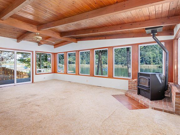 Workshop spaceAlsea riverfront homeCovered deckSeparate laundry roomVaulted beamed wood ceilingDouble garage doorsCustom wall of windows