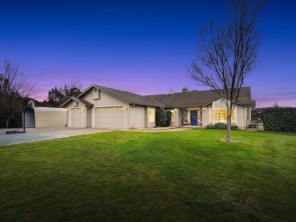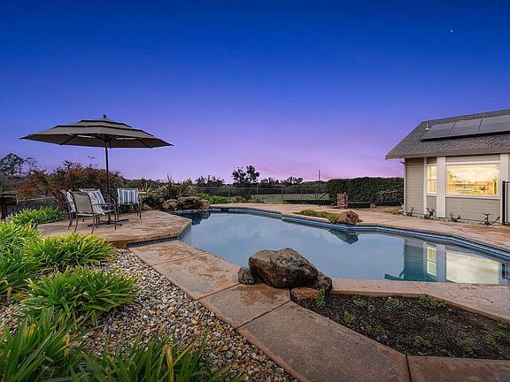 Fantastic Single Story Home on 5 amazing park like acres. 4bed/2bath. Large family room with built-in bookcases and cozy fireplace. Dining room plus extra bonus/family/office room. Large 3 car garage with plenty extra storage. Entertainers backyard with a fenced sparkling swimming pool. SOLAR. Large garden area with garden beds. Acreage includes pastures, fenced backyard, chicken coop and lots of extra parking. A must see!