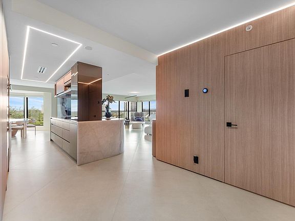 From the moment you step inside, the residence captures the essence of a private yacht where craftsmanship and comfort meet the rhythm of the sea. The expansive open-concept living space is wrapped in natural light and anchored by floor-to-ceiling impact glass framing unobstructed Atlantic vistas. The gourmet kitchen serves as both a design centerpiece and culinary showcase, featuring Cristallo quartzite countertops and waterfall island, custom wood and glass cabinetry, and the finest Wolf, Sub-Zero, and Miele appliances, including a built-in Miele coffee system.
