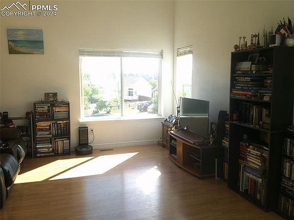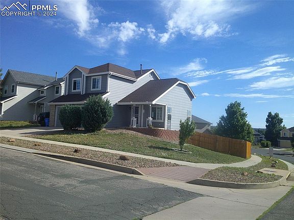 Very well maintained home on corner lot with views of the mountains. Walk into the spacious living room with Pikes Peak views. Hardwood flooring throughout main level has a dining room, kitchen, half bath and laundry area. All stainless steel appliances in kitchen stay. Upstairs are 3 spacious bedrooms. Master has a full bathroom with tub/shower. Second bathroom is also a full bathroom. The basement has insulation and drywall up so it would not take much to finish it. There is room for another bedroom, family room, bathroom and some storage. The basement walks out to the fenced backyard. There is a wood deck going upstairs to the dining area. RV parking available in the front on the left side of the home. No covenants!