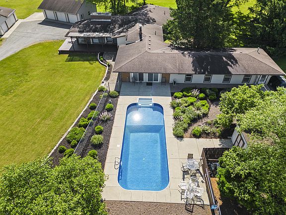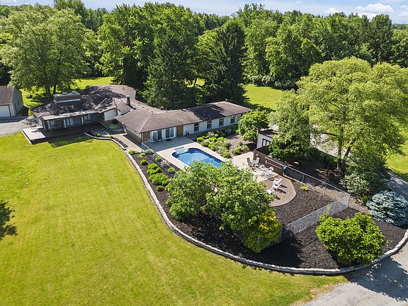 Sprawling ranch on 4+ private acres, it is a MUST SEE w/ too much to list! This 3500sf, 5 bed, 3 bath has it all. Inside find a huge great room with fireplace and solar shade skylights, primary suite and 2 ''wings'', both with kitchens. Layout allows versatility for one large family, a private suite for guests, separate independent living quarters for family members needing care, or create an entertainment space w/ the large kitchen opening onto the 16x44 pool and patio. Other entertainment features: hot tub, 3 season room, and deck. For toys: 2 garages for 5 cars and upper storage attic. New paint and new updates. Relentlessly maintained and improved inside out. Country living at its best! New HVAC and H2O tank, beautiful landscaping, 6 panel doors, cedar closets, fireplace.