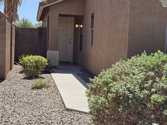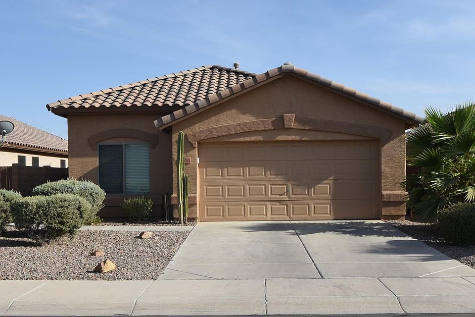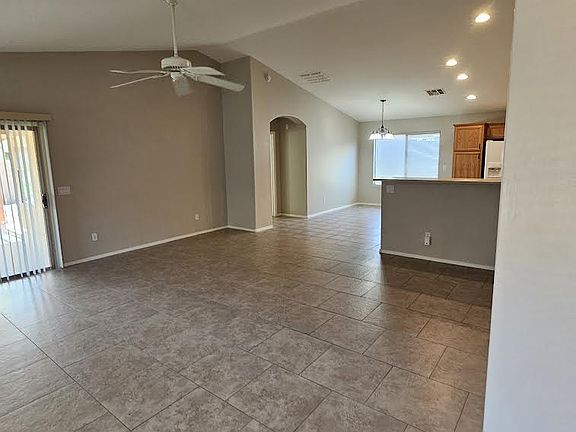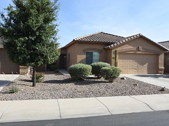 GORGEOUS home in Maricopa Meadows. - open concept floor plan perfect for entertaining, kitchen with upgraded cabinets and new counter tops, and huge master bedroom split from the other two bedrooms with separate tub and shower and large walk-in closet. When you enter the front door, you're greeted by the open-concept floor plan with lots of natural light, though the home has window treatments. All Rooms are tile. Relax on the big covered patio after a hard day at work. This home sits on a nice lot with north/south exposure and beautiful mountain views in the front. Maricopa Meadows has a disc golf and 40 acres of Green Minimum 1 year lease may consider 18 months. 2.5 car garage with storage cabinets. No Smokers See pets policy (although a small dog may be considered)