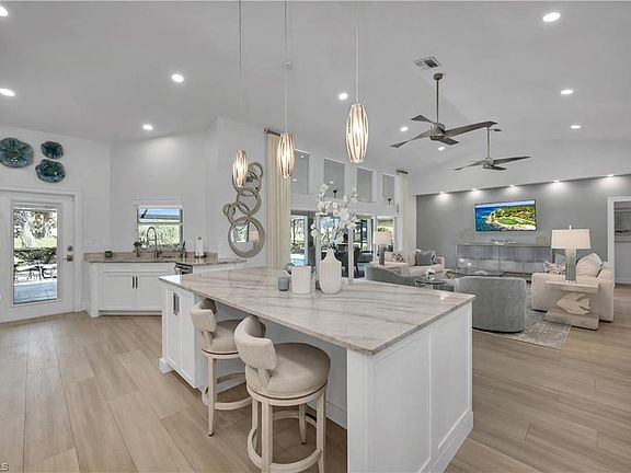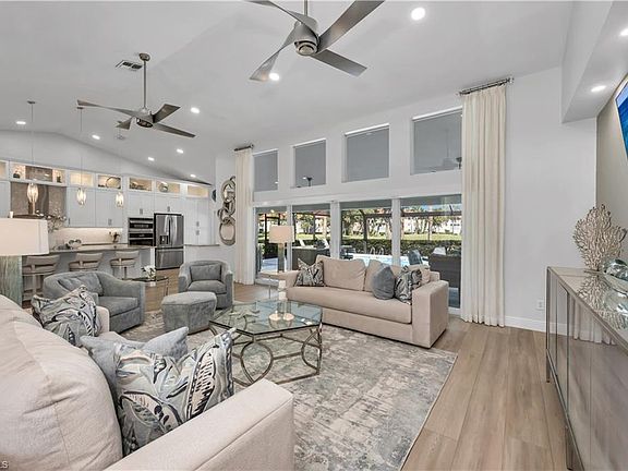 Located in the desirable community of Royal Wood, this STUNNING NEWLY REMODELED home with a fabulous open concept design is a must see! Re-designed from top to bottom throughout, the home features COUNTLESS HIGH-END UPGRADES (extended warranties included), such as soft close cabinets, plantation shutters, cathedral ceilings, custom crown molding, decorative LED lit wall in living room, upgraded floors, built-in closet shelves, new GE Profile appliances (5-year warranty), Taj Mahal quartzite countertops, and new plumbing and modern light fixtures. Your outdoor oasis overlooks the first hole of this PRIVATE GOLF COURSE and boasts a “picture window” pool screen, hand cut decorative lanai deck, mosaic glass pool tile, weather resistant outdoor kitchen, and automatic shutters. Take in SPARKLING LAKE VIEWS and lush surroundings while relaxing in the pool or enjoying colorful sunsets. This amenity-rich BUNDLED GOLF community with low HOA fees features an elegant clubhouse with full bar and grill, fitness center, large community pool, tennis, pickleball, and bocce. Minutes to downtown Naples with its upscale shops and restaurants and our beautiful beaches, this gem is sure to sell quickly!