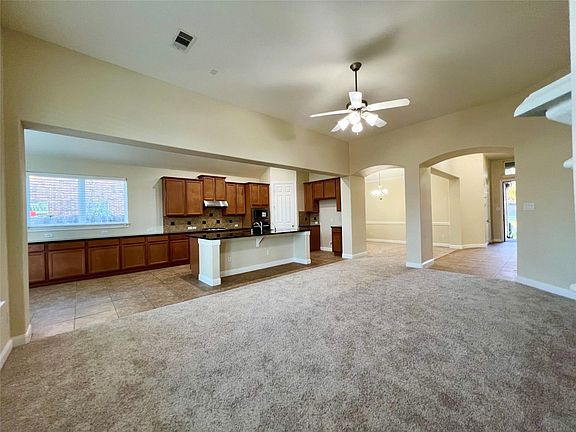 Great one-story home in Riverstone with a large family room. Tile floors in entry, kitchen and breakfast. Kitchen opens to the family room. Stainless steel appliances including a new gas cooktop. Granite counter tops in the kitchen. Primary bathroom has separate tub and shower. All new carpet throughout. Covered patio in the large backyard. No backyard neighbors. Brick on all four sides. Sprinkler system included. Zoned to excellent schools including Ann Sullivan Elem, Fort Settlement MS and Elkins HS.