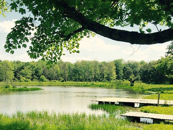 Reduced! Beautiful 10+ acres in Taylor NY. This property is on top of a mountain with 3 acre pond, some woods but mostly cleared park like setting. Special features include a working well, free standing fireplace with concrete slab great for RV parking, and two decks. Property is few feet away from state forest, very quiet and peaceful area. Great for those who love nature, fishing, hunting, etc., great place to get away to, or build a waterfront cabin!