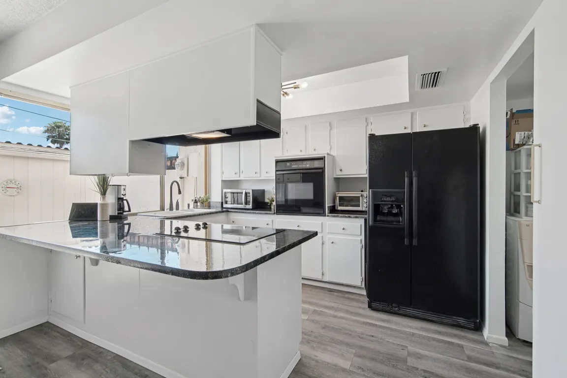 Contemporary stylePrivate patioCustom-coated counter topsWalk-in showerResurfaced white cabinetsSmartly upgraded homeSeparate vanity area