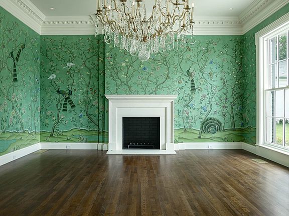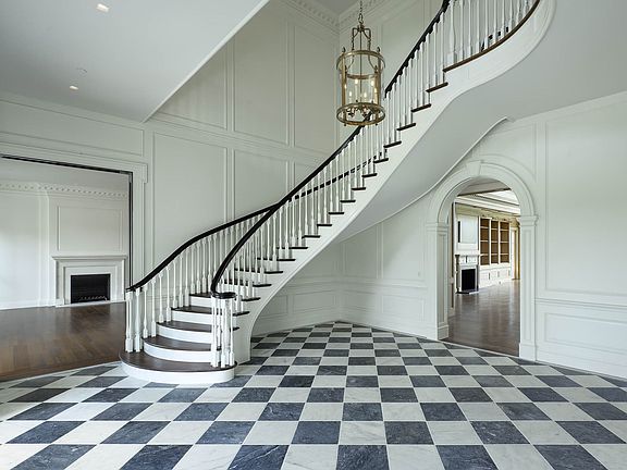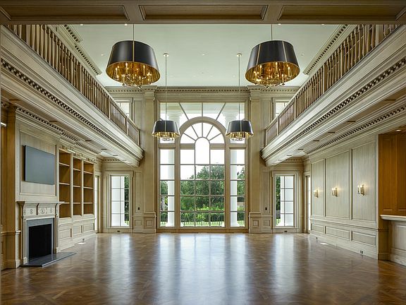 Inside, a checkerboard marble entryway sets the tone for the home’s striking aesthetic. The Great Room soars with 23-foot ceilings, leading to an entertaining wing designed for hosting on a grand scale. A glass-ceilinged conservatory and a barrel-vaulted banquet hall provide