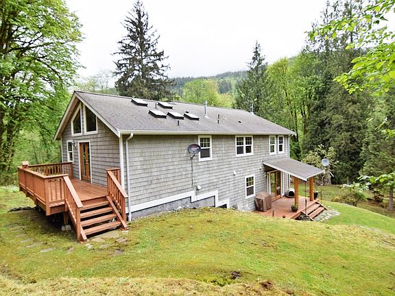 This beautiful well-built custom home on 6+ acres offers a sunny, secluded and peaceful retreat. Huge log beams and supports, 9' ceilings, wood trim throughout, oak floors, freestanding wood burning stove, are a few of the special features. An abundance of windows flood the home with light. Huge master bedroom with jacuzzi bath and walk-in closet opens onto its own deck. Two more large bedrooms and office/bonus room double as a 4th bedroom. Over-sized 2-car garage. Only 30 min to Bellingham.