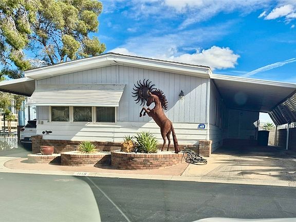 Strip Views!! Large converted manufactured home with 3 bedrooms and 2 bathrooms, Vaulted ceiling with beautiful wood beamed accents. AC and furnace replaced in 2023 Hot water heater and roof replaced in 2022. Convenient location close to Las Vegas Strip with two outside porch/covered patio areas. Covered carport which can accommodate two cars. Beautiful outdoor metal horse sculpture is included in the sale.