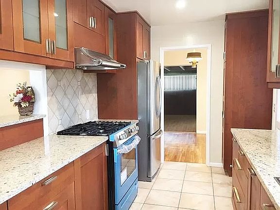 Remodeled kitchen with granite countertops, newer cabinets, stainless steel appliances, and a stove.