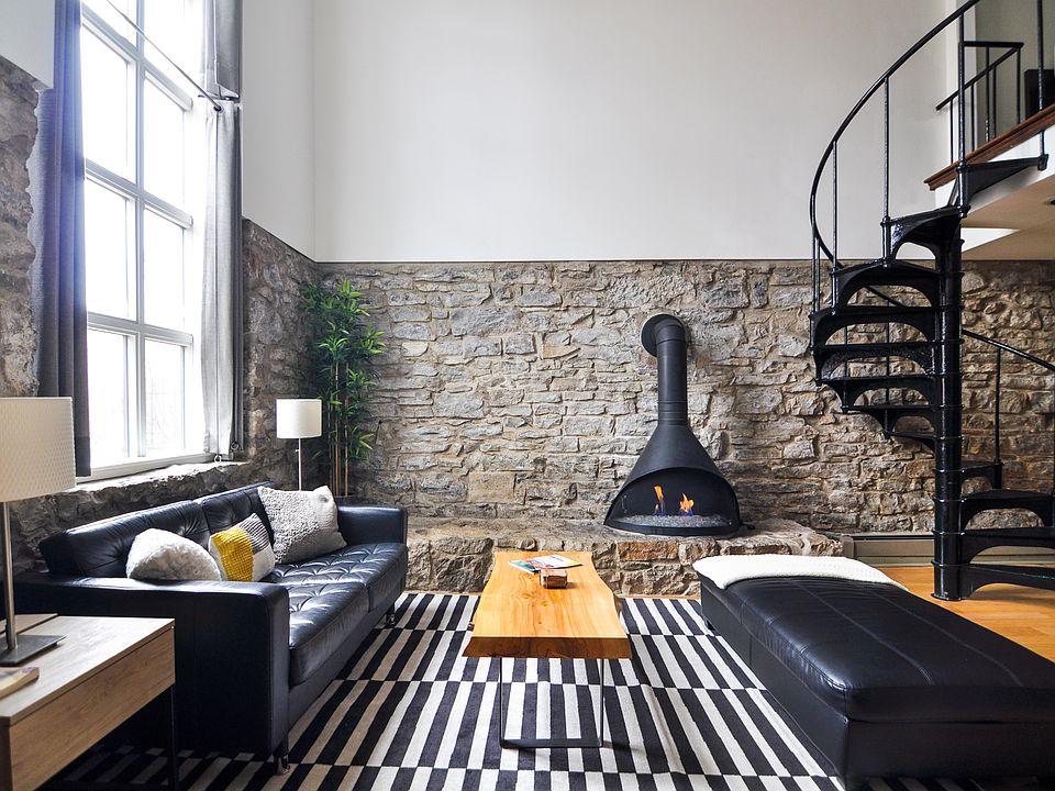 The dramatic open living room features 20ft ceilings and a 16'x6' window, flooding the space with natural light. Climb the wrought iron spiral staircase to the primary bedroom loft. There's also an additional rear staircase with access to the 2nd floor that connects the back two bedrooms. Enjoy the large front patio to watch the neighborhood stroll by. If you'd prefer more privacy, we have a second brick patio at the rear of the building with a table, grill, and fire pit.