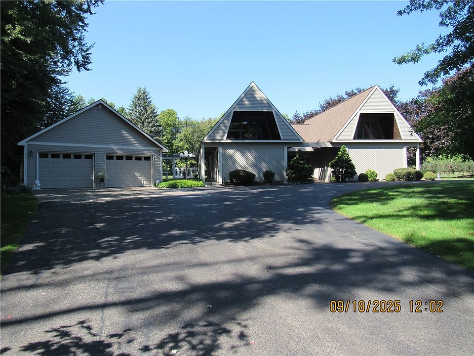 Welcome to a truly one-of-a-kind custom-built home, brought to life in 1971 by a couple inspired by a magazine dream. Nestled on a serene and private 5-acre lot in the heart of Sodus, this property offers a rare blend of timeless charm and modern comfort. Step inside to discover a spacious open-concept layout in the over 2700 square foot living space, perfect for entertaining guests or enjoying quiet evenings at home. Natural light pours in through large windows, illuminating the warm wood tones and unique architectural details throughout. Additional space is available in the first floor office with a sliding door to allow a comfortable breeze while working. Don't need the office space? This could easily serve as an additional bedroom. Two large loft areas, each accessed by it's own spiral staircase, offer endless possibilities—think art studio, guest space, cozy reading nook, or extra bedroom space appealing to your young teens. The kitchen is a chef’s delight, featuring modern stainless appliances, a generous granite countertop and island with seating, and seamless flow into the dining and living areas. The master bedroom has a large walk-in closet and a sliding glass door opens directly to the outdoors to an additional deck space, offering peaceful views of the beautifully landscaped grounds. A large unfinished basement offers additional living or recreational space and comes with a custom built bar. Other amenities include first floor laundry, a two car garage, a central vacuum system, whole house generator, (all appliances included), and more.... Outside, enjoy expansive lawns, mature trees, and thoughtfully designed landscaping that creates a private oasis just minutes from town conveniences and Lake Ontario. Enjoy the comfort of relaxing on one of your two decks to bask in the sunshine, or enjoy the shade and protection from the elements under the new SunSetter awnings. There is just too much to list and so much to fall in love with, both inside and out!!!