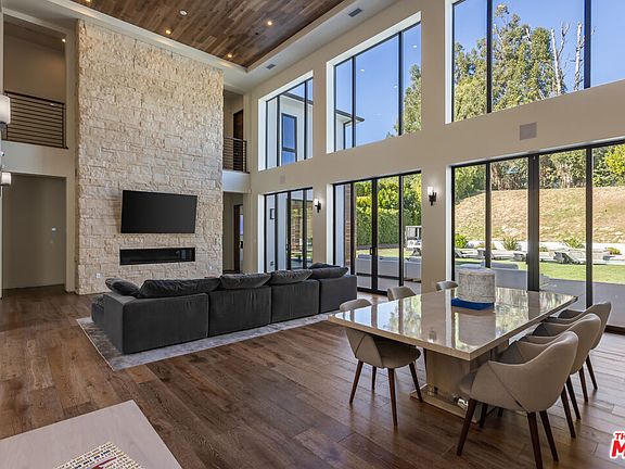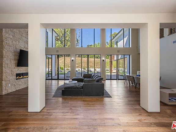 An Exceptional Contemporary Estate South of the Boulevard. Tucked discreetly behind private gates in one of Tarzana's most distinguished enclaves, this custom-built contemporary residence exemplifies the pinnacle of modern design and luxury living. Completed in 2017 and set upon an expansive one-acre parcel, this 8,00-square-foot architectural showpiece combines grand scale with the finest craftsmanship and an effortless indoor outdoor flow. Upon entry, a soaring double-height foyer introduces interiors bathed in natural light, framed by dramatic walls of glass and impeccable detailing throughout. The open-concept living and dining spaces evoke a sense of grandeur, while the chef's kitchen anchored by a substantial quartz island and fitted with bespoke cabinetry and integrated Thermador appliances caters effortlessly to both family living and formal entertaining. The main level also features a private study, state-of-the-art cinema, temperature-controlled wine room, and a generously appointed guest suite. Upstairs, the luxurious primary retreat offers a tranquil sanctuary, complete with a fireplace, two custom-designed dressing rooms, a spa-inspired bath with steam shower, and a private terrace capturing sweeping views of the manicured grounds. Outdoors, the estate reveals a resort-caliber setting designed for both relaxation and celebration. Accordion-style glass doors open seamlessly to a sparkling pool, spa, and cascading waterfall, surrounded by multiple terraces, a fire pit, and a fully equipped outdoor kitchen and barbecue pavilion. Further enhancing the residence are dual laundry rooms, a three-car garage, comprehensive security system with cameras, and the latest in smart home technology. A rare fusion of sophistication, privacy, and modern elegance this is an extraordinary Tarzana estate for the most discerning of tastes.
