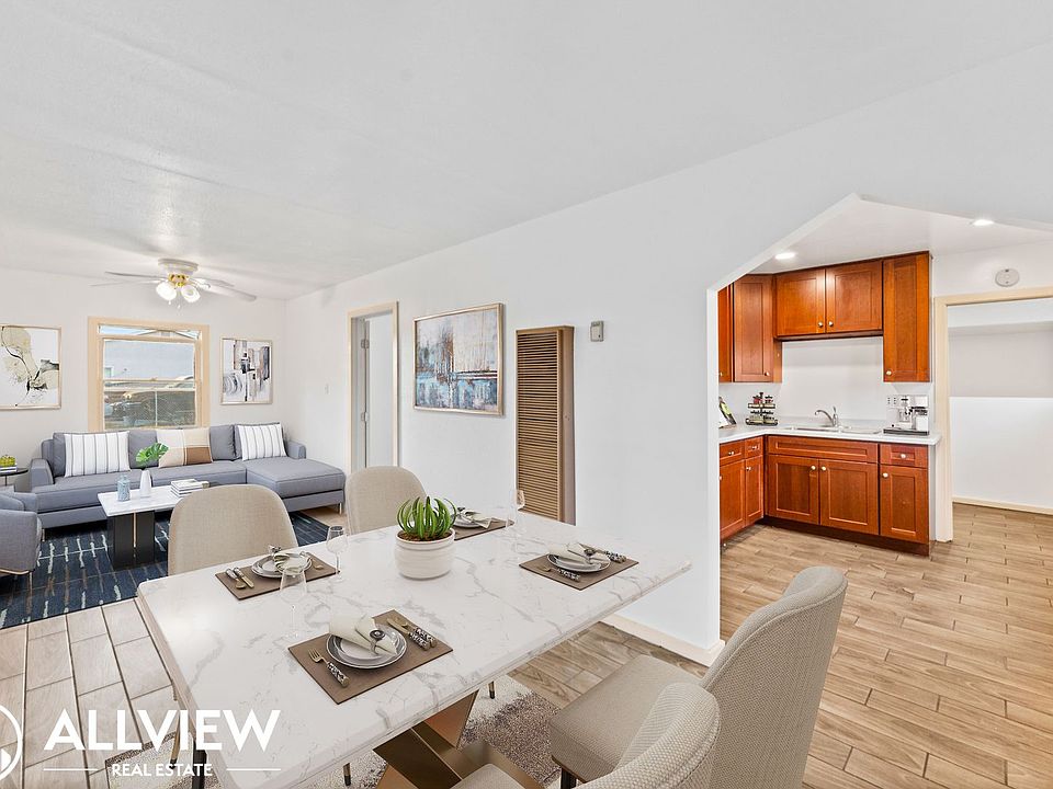 Spacious backyardSleek tile floorsQuartz countertopsElegant shaker cabinetsFire pitCeiling fans
