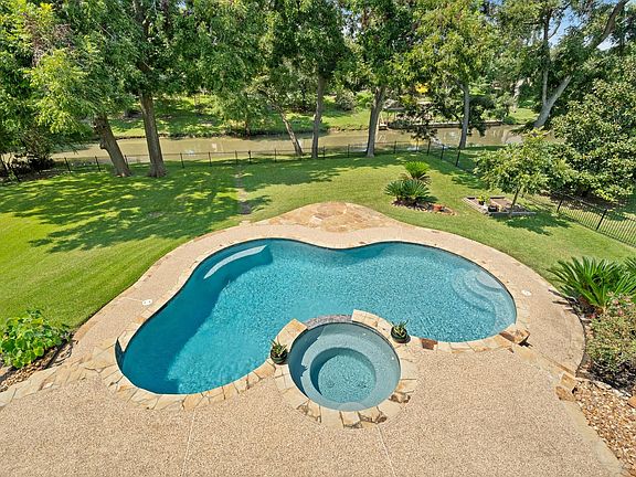 This WATERFRONT, two-story home with POOL & SPA offers privacy and an incredible setting with no back neighbors! Inside you are treated to hardwood flooring, soaring ceilings with accent details, a refreshingly neutral color palette, and impressive upgrades. French door entry to Study with wood, coffered ceiling, storage and desk built-ins. Dining Room with access to Butler’s Pantry. The Kitchen features natural wood cabinets, gas cooktop, two sinks, and walk-in pantry. Primary Suite includes picture windows, impressive walk-in closet, garden tub, and oversized shower. Second Bedroom on first floor is perfect for guests or SECOND PRIMARY. Spacious Game Room upstairs with French doors that lead to covered Patio. Large freeform POOL includes raised SPA and waterfall features. Covered Patio equipped with built-in grill and sink. Oversized 2-car garage finished with accent flooring and attached 2-car covered Carport. Water softener & LOW TAXES!