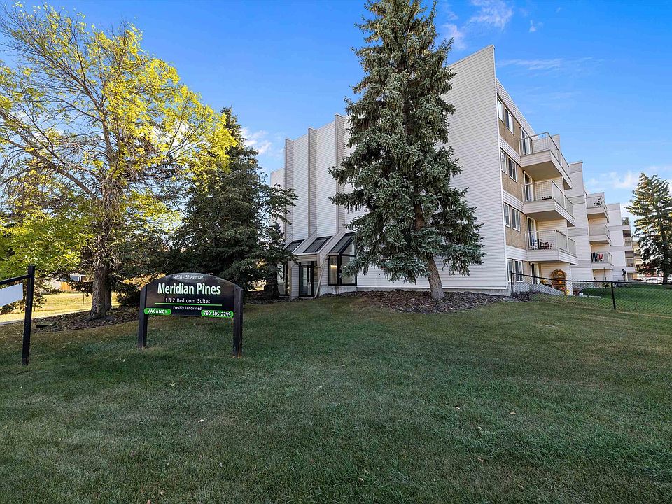 Welcome home to Meridian Pines! This updated 1-bedroom condo is a fantastic opportunity for all buyers or investors. Featuring vinyl plank flooring throughout, a large patio door and more windows makes for a bright, functional layout. The kitchen has white cabinetry, includes a dishwasher and flows into the spacious dining and living areas, perfect for relaxing or entertaining. Step out onto your west-facing balcony and enjoy peaceful views and great sunsets. The king-sized bedroom with ample closet space, a 4-piece bath and tons of in-suite storage add to the comfort. Laundry is just down the hall, and an assigned powered parking stall is included. This well-managed building offers great curb appeal in a quiet residential area, with easy access to shopping, dining, and more. A rental pool program is available, and the unit is currently tenant-occupied at $1,150/month—ideal for hands-off investors. Don’t miss this affordable and move-in-ready opportunity!