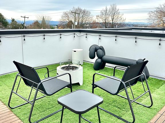 The huge roof deck with outdoor chairs and tables allow you to relax while enjoying the views of Seattle city skyline, Mt. Rainier, Space Needle, Cascade mountains, etc.