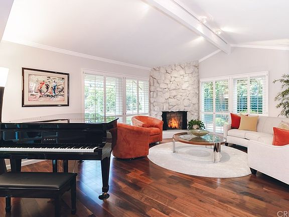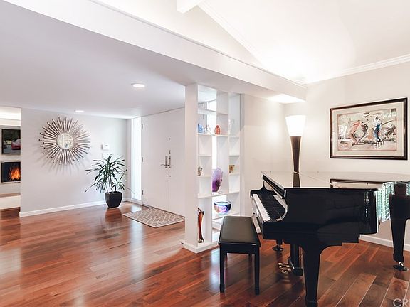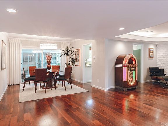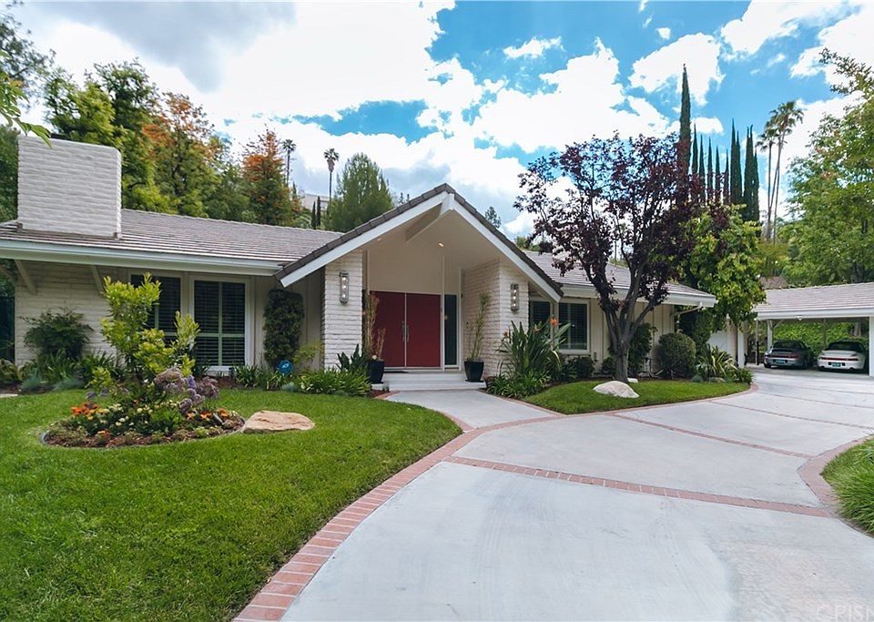 Sophisticated, immaculate, and tastefully remodeled Mid-Century Modern home with sweeping, impressive frontage nestled in an enchanting setting South of Ventura Blvd! Gracious double door entry opens to inviting one level home with rich upgrades including burnished walnut engineered wood floors, recessed lighting, and plantation shutters. Airy and bright Living Room with dramatic vaulted ceilings and romantic fireplace. The sleek Formal Dining room is enhanced by a dazzling chandelier. Upgraded kitchen with granite countertops and top of line appliances, with a charming breakfast area and sliding glass doors opening to the alluring back yard. "Floating" soffit in Family Room with mood lighting, built in book shelves, and cozy fireplace make this a pleasurable place to relax at the end of the day. Master Bedroom graced with elegant master bath vanity with quartz counter top, double sinks and porcelain tile floors, plus modern glass enclosure in master bath surrounding relaxing soaking tub and spacious shower. The guest bedroom boasting mirrored wardrobe has access to full bath. Newer sparkling custom pool with waterfalls and bubbling spa wrapped in flagstone ribbon conjures romantic summer nights. Lush grounds with expansive grassy play area framed in luxurious mature landscaping. Outdoor entertainment center complete with refrigerator, cook top and BBQ for adult entertaining and family fun. Pride of ownership and quality shines throughout the home.