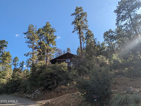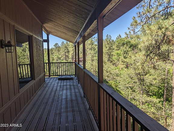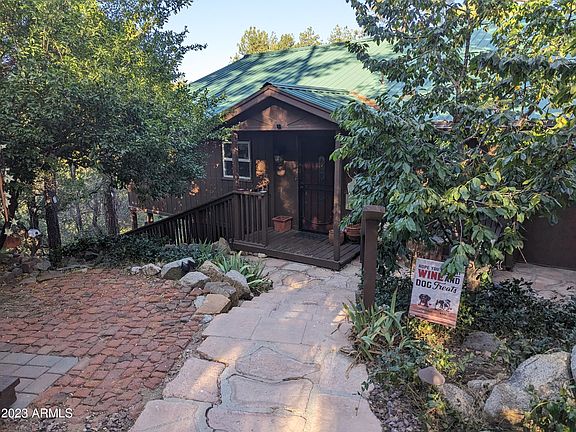 Do you remember as a kid playing in a treehouse? You can have that magical feeling again with your very own adult treehouse. This special home is situated in the beautiful neighborhood of Ponderosa Park. Nestled in the magnificent Prescott National Forest, you will find this beautiful 3-bedroom, 3-bathroom home with detached guest quarters. From the moment you pull up the drive, the whispering Ponderosa pines invite you in. Upon entering the home, you are surrounded by expansive views from multiple windows. The beautiful wood tongue and groove wrap all the way around and up to the soaring vaulted ceilings. The stacked stone, wood burning, floor to ceiling fireplace is perfect for cozy fall and winter evenings. The open kitchen boasts espresso cabinetry, black granite counters and stainless-steel appliances. The primary suite is complete with doors leading out to the deck and double sinks in the primary bath. A charming secondary bedroom is on the main level as well as an additional bathroom for guests. Upstairs you will find a unique loft space that can be used for additional sleeping quarters or an office. The full basement features a huge bedroom, closet, and full bathroom. It has a separate entrance and patio area that can be fully private for guests. The guest home has been renovated and is currently being utilized as a pastry kitchen. It has both electricity and water, and a bathroom can easily be added. The outdoor living space has five mature fruit trees (1 cherry, 2 apples, 1 pear and one plumcot). Over 500 sq ft of wrap around decks and spaces to relax and enjoy the cool breeze and hot tub. You can even hear seasonal Indian Creek running from the patio. The entire property is fully fenced to keep your fur-babies safe. Come and see for yourself how special this property really is. Only 6 minutes from downtown and all the wonderful activities that Prescott has to offer. Not included in county assessor square footage is approx 375 sq ft loft and approx 200 sq ft guest quarters. Buyer to verify all information.