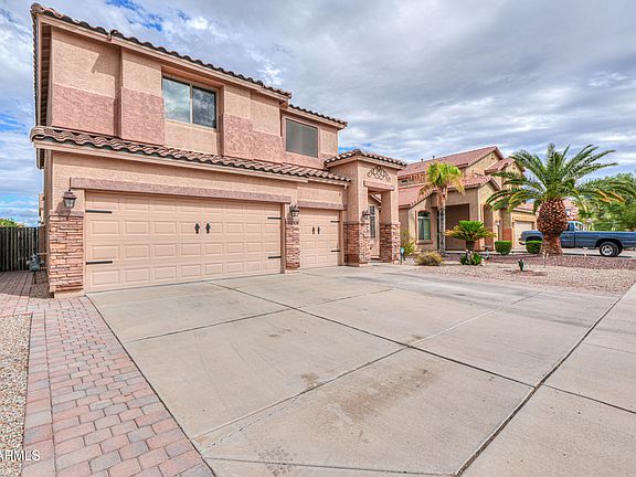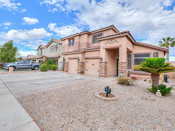 3 CAR GARAGE! This gorgeous & expansive home shows true pride of ownership & boasts an entertainer's floorplan with 6 spacious beds with walkin closets, 3.5 baths (including second master), formal living/dining room & large great room! Upgrades abound & include vaulted ceilings, designer paint throughout, wood laminate flooring in all the right places & more! Chef's kitchen features Grey cabinetry, granite countertops, SS appliances, double ovens & dining nook! Palatial master bedroom boasts walk-in closet & ensuite bath with dual sinks & separate shower & soakin! Backyard oasis with full covered patio, pergola, outdoor kitchen, artificial turf & pizza oven! Located in one of Maricopa's premier subdivisions- Maricopa Meadows- with expansive lake, tot lots & close to schools & shopping!